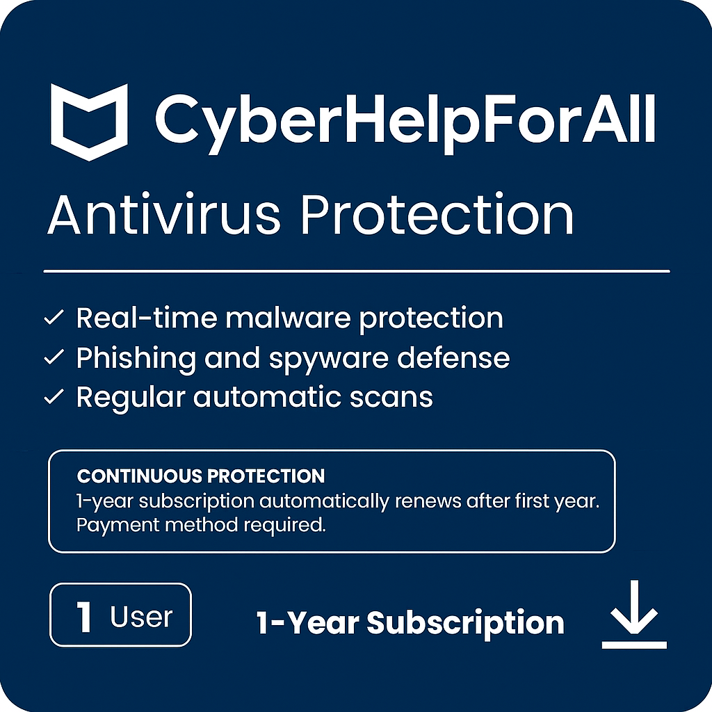 CyberHelpForAll Antivirus Protection delivers proactive security against all types of cyber threats. Powered by a smart engine, it ensures instant virus neutralization, email protection, and safe browsing. Perfect for both home and small office use.